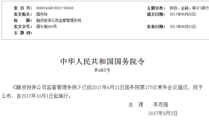 為了規(guī)范融資擔(dān)保公司的行為,防范風(fēng)險(xiǎn),2017年8月2日,國(guó)務(wù)院總理李克強(qiáng)簽署國(guó)務(wù)院令683號(hào),公布《融資擔(dān)保公司監(jiān)督管理?xiàng)l例》(以下簡(jiǎn)稱(chēng)條例),自2017年10月1日起施行。