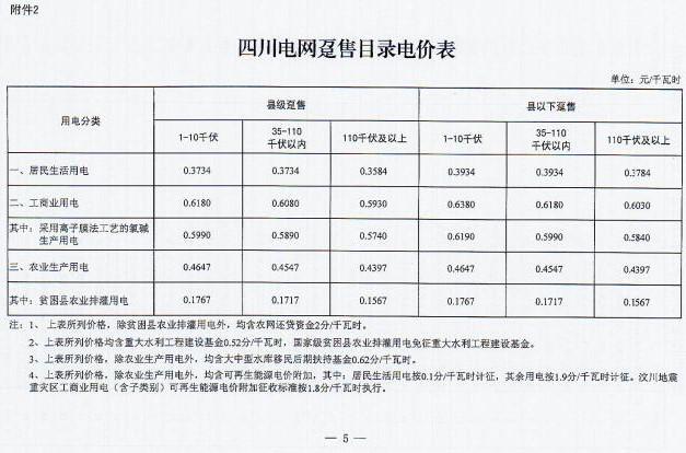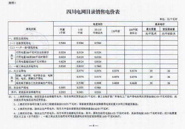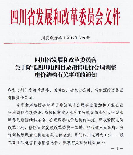 近日,四川省發(fā) 改 委發(fā)布了《四川省發(fā)展和改革委員會關(guān)于降低四川電網(wǎng)目錄銷售電價(jià)合理調(diào)整電價(jià)結(jié)構(gòu)有關(guān)事項(xiàng)的通知》(以下簡稱“通知”)。通知指出,自2017年7月1日起,取消向燃煤發(fā)電企業(yè)征收工業(yè)企業(yè)結(jié)構(gòu)調(diào)整專項(xiàng)資金,降低重大水利工程建設(shè)基金和中大型水庫移民后期扶持基金征收標(biāo)準(zhǔn),降低后的征收標(biāo)準(zhǔn)分別為0.52分/千瓦時、0.62分/千瓦時。燃煤發(fā)電機(jī)組有關(guān)電價(jià)政策另行明確。具體情況如下: