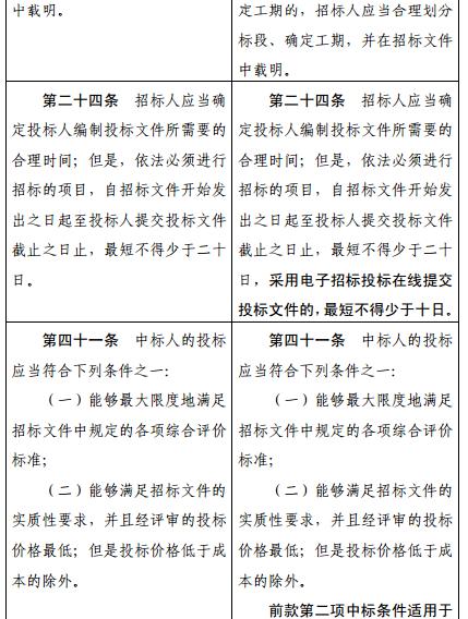 五、將第二十四條修改為:“招標(biāo)人應(yīng)當(dāng)確定投標(biāo)人編制投標(biāo)文件所需要的合理時間;但是,依法必須進(jìn)行招標(biāo)的項目,自招標(biāo)文件開始發(fā)出之日起至投標(biāo)人提交投標(biāo)文件截止之日止,最短不得少于二十日,采用電子招標(biāo)投標(biāo)在線提交投標(biāo)文件的,最短不得少于十日。”
