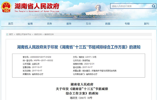 關于湖南省政府印發《湖南省"十三五"節能減排綜合工作方案》的通知