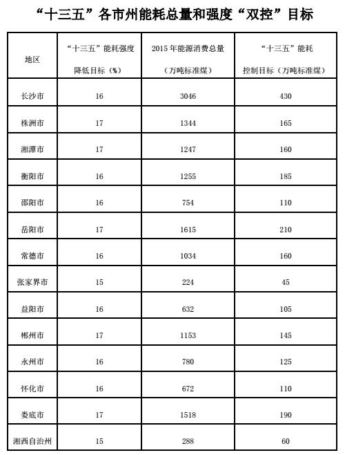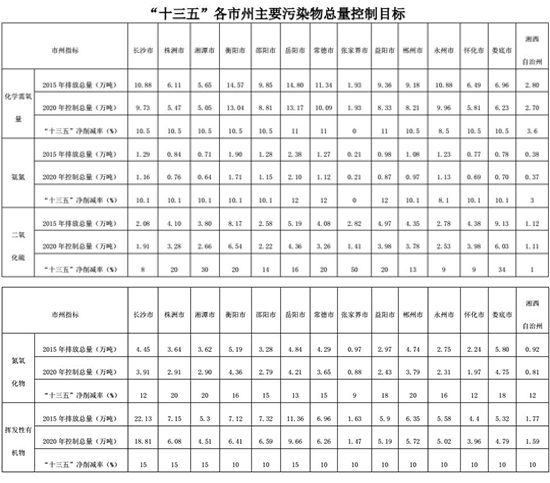 (二)主要目標。到2020年,全省萬元生產總值能耗比2015年下降16%,能源消費總量控制在17849萬噸標準煤以內。全省化學需氧量、氨氮、二氧化硫、氮氧化物、揮發性有機物排放總量分別控制在108.57萬噸、13.58萬噸、47.05萬噸、42.24萬噸、88.45萬噸以內,比2015年分別減少10.1%、10.1%、21%、15%、10%以上。常德市、益陽市、岳陽市總磷排放量均下降10%以上。