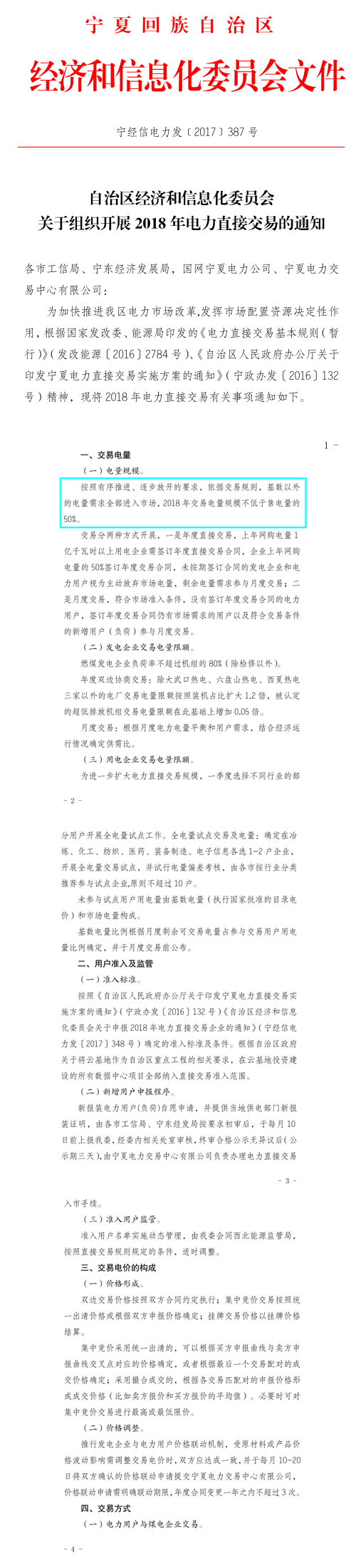 近日,寧夏經(jīng)信委發(fā)布《關(guān)于組織開展2018年電力直接交易的通知》(以下簡稱“通知”),通知中稱,基數(shù)意外的電量需求全部進(jìn)入市場,2018年交易電量不低于售電量的50%。