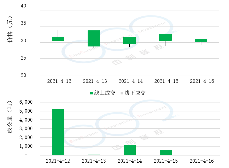 線下成交價(jià)最低為16.88元,最高為25.30元,平均碳價(jià)為19.66元。
