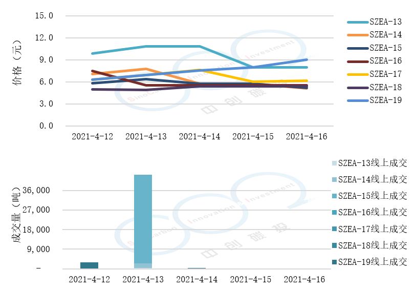 線上成交價(jià)最低為4.94(產(chǎn)品SZEA-18),最高為10.82元(產(chǎn)品SZEA-13),平均碳價(jià)為7.00元(平均碳價(jià)為各產(chǎn)品價(jià)格加權(quán)得出)。