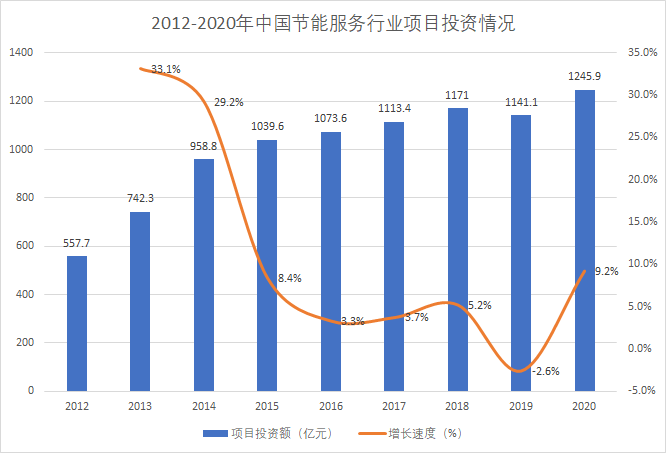 近年來,中國節(jié)能服務(wù)能效項(xiàng)目穩(wěn)健開展,2020年,節(jié)能服務(wù)行業(yè)項(xiàng)目投資額約為1245.9億元,同比上漲9.2%。