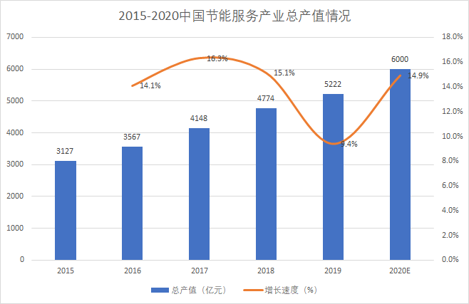 近年來,節(jié)能服務(wù)產(chǎn)業(yè)總產(chǎn)值不斷增長,呈逐年上漲趨勢。中國節(jié)能協(xié)會數(shù)據(jù)顯示,2019年我國節(jié)能服務(wù)產(chǎn)業(yè)總產(chǎn)值達(dá)5222億元,同比增長9.38%。根據(jù)《“十三五”節(jié)能環(huán)保產(chǎn)業(yè)發(fā)展規(guī)劃》,到2020年節(jié)能服務(wù)業(yè)總產(chǎn)值達(dá)到6000億元。我國節(jié)能服務(wù)行業(yè)潛力巨大。